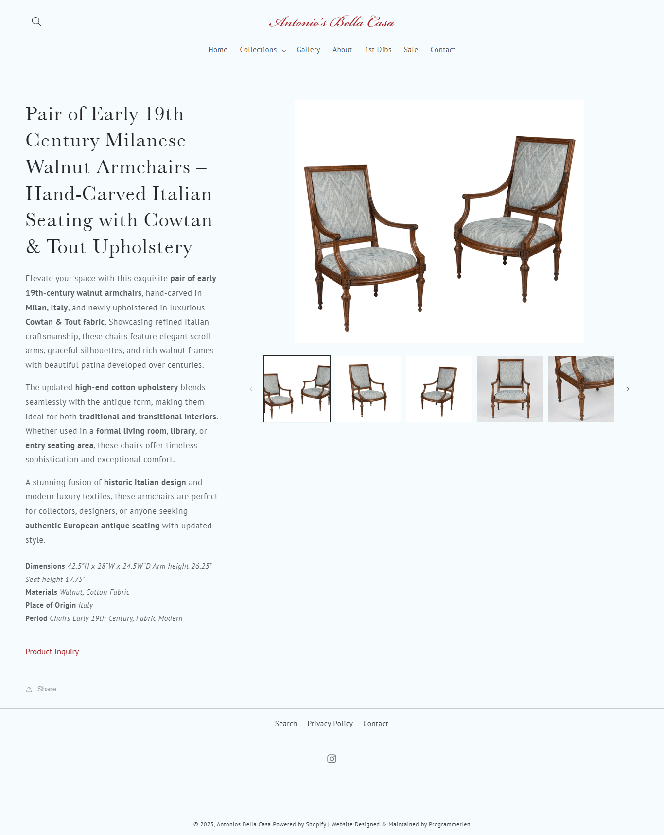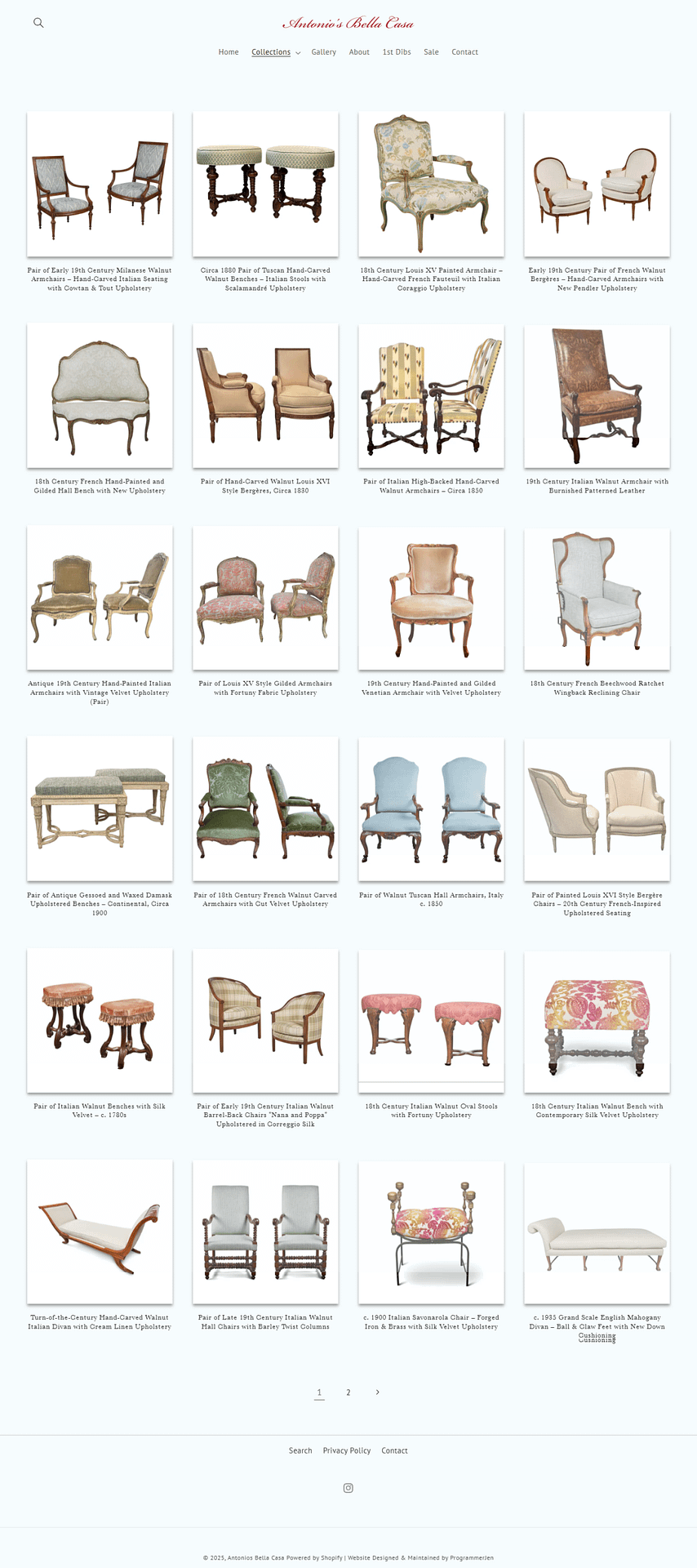 Antonio’s Bella Casa has been a client for over 12 years, the website has seen many revisions over those years. The owner Tony travels to abroad to find unique and high-end antiques, art, and more that you won’t find anywhere else. For the latest website version we decided to move to Shopify even though the site does not sell via e-commerce…the higher prices require in person processing to purchase these stunning pieces…but we wanted the ease of use of the Shopify platform to manage the large amount of products and regular updates.