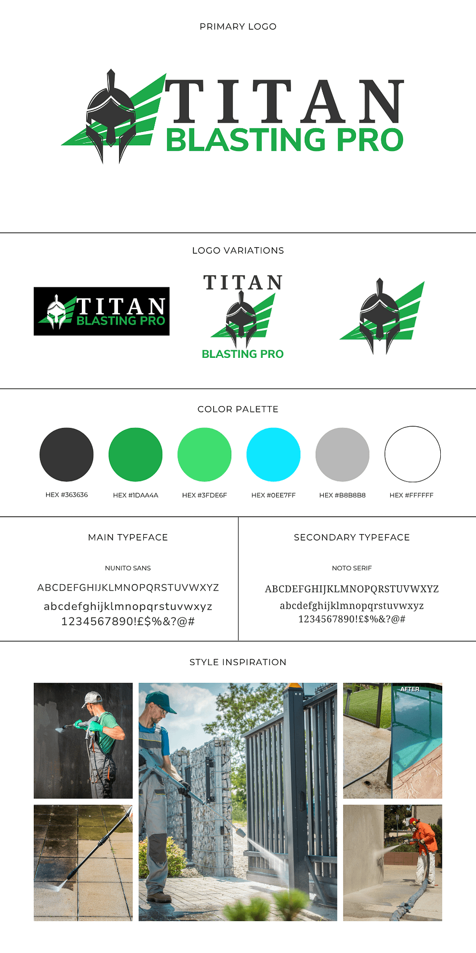 Titan Blasting Pro is a local Scottsdale/Phoenix business owned by my boyfriend Eric. I started with a full branding board to show off the logo, color palette and inspiration for the branding. Dustless blasting is an eco-friendly alternative to sandblasting and I wanted to bring the bright green into the branding to represent the eco-friendly message.